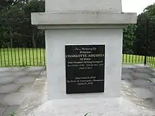 An obelisk in memory of Charlotte was erected by the then Liberal MP for Walsall, Robert Wellbeloved Scott, in the grounds of his country house (now Red House Park, in Sandwell).[107] Having become badly damaged through age, the obelisk was restored in August 2009,[108] at cost of £15,000.[109]