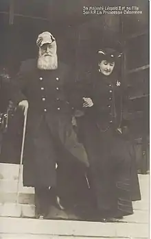 From 1905, Clémentine settled down permanently at Belvédère Castle,[52][53] and sometimes also lived in her late mother's villa in Spa. To distract herself, she paid a few visits to the painter Edwin Ganz (specialist in the representation of horses and an artist close to the Belgian royal family,[54] in particular to Clémentine[55]), who was lodged by her aunt Empress Charlotte of Mexico in her Bouchout Castle. She made one or two visits at Balmoral, with King Edward VII. In 1907, a certain harmony was reborn between Clémentine and her father. She sometimes joined him at his property in the south of France.[52] In the fall of 1909, Leopold II was subject to an intestinal obstruction and had to be operated on. The outcome of the surgery was fatal: the King died of an embolism on 17 December 1909. Clémentine was deeply affected because she had, despite their differences, managed to maintain a special relationship with her father.[52][56]