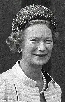 Joséphine-Charlotte became president of the Luxembourg Red Cross in 1964. She was president of Luxembourg Youth Section of the Red Cross.[2] She also served as honorary president of the Luxembourg Philharmonic Orchestra. She became the chief guide of Luxembourg’s guides movement in 1990. She was the patron of the Union of Voluntary Blood Donors and the Luxembourg Paediatrics Society. The Grand Duchess also oversaw the restoration of the Grand Ducal Palace from 1991 until 1996. She became a patron and honorary president of l’association pour la protection curative de l’enfance,[3] the Scouts and Guides of Luxembourg,[3] the Equestrian Federation,[3] les Jeunesses musicales,[3] the International Bazaar of Luxembourg and the Hëllef fir kriibskrank Kanner Foundation.[3] She also regularly visited Luxembourg's social and cultural centers, establishments, institutes, hospitals and nurseries.[3]