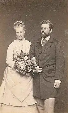 Louise had been kept away from the matrimonial negotiations concerning her. However, once informed of her inminent engagement, she remembered favorably her future husband, fourteen years her senior, glimpsed during his visits to Brussels and that if they had said insignificant things to each other, she had the impression of "know him well, and have always been".[21] She was looking forward to getting married. The betrothal, celebrated on 25 March 1874,[22] lasted for a year because Louise had not reached yet a marriageable age and because both bride and groom were closely related a papal dispensation was required. After financial negotiations (King Leopold II wished to spend as little as possible), the wedding was concluded at the Royal Palace of Brussels on 4 February 1875.[23]