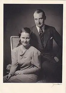 Sophie became entangled in the small diplomatic scandal as preparations for the Dutch wedding commenced. The German Nazi government, apparently outraged that their flag was not used in festivities related to the wedding, refused to release the passports of Sophie, along with those of Bernard's cousins Princesses Sieglinde and Elizabeth zur Lippe.[3][4][5] The German government stated that they were also protesting supposed anti-Nazi incidents in the Netherlands, and was angry that Juliana's German fiancé Prince Bernhard had not publicly defended the Nazi regime there.[4][5] Wilhelmina and the Dutch government responded that because they believed the wedding to be a private, family affair, the use of the German flag would be inappropriate; they instead opted to fly the Dutch national flag alongside the flag of Bernhard's family.[3][6] German displeasure also applied to their national anthem; Wilhelmina and the Dutch government saw no need in playing it at the wedding, as Bernhard was now a Dutch citizen, and thus no longer held German citizenship.[6] A note of protest was sent to Berlin, declaring that the withholding of the necessary documents was "an insult to the Queen".[3] Though the Dutch minister to Berlin apologized for one of the incidents concerning the Nazi flag (in which it was taken from a German school in the Hague), the Nazi government regarded his statement as "insufficient".[4][5] The passports were not released until Prince Bernhard sent a personal letter to German Chancellor Adolf Hitler.[3]