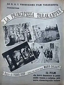 Princess Tarakanova (Italian: La principessa Tarakanova) is a 1938 French-Italian historical film directed by Fyodor Otsep and Mario Soldati and starring Annie Vernay, Pierre Richard-Willm and Roger Karl.[1] It portrays the life of the 18th century pretender to the Russian throne Princess Tarakanova. The story has been turned into films a number of times including a 1930 film, Tarakanova.