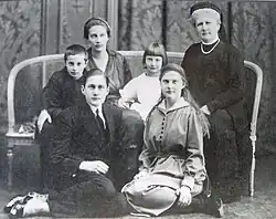 Left to right back row: Princess Tatiana; Prince Gabriel; Prince Ivan; Grand Duchess Elizabeta Mavrikievna and Grand Duke Constantine Constantinovich. Front row: Princess Vera; Prince George; Prince Igor; Prince Oleg and Prince Constantine, 1911.