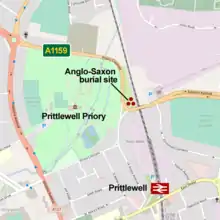 In the autumn of 2003, in preparation for a road-widening scheme, an archaeological survey was carried out on a plot of land to the north-east of Priory Park in Prittlewell. Earlier excavations had indicated Anglo-Saxon burials in the area, however it was not expected that such a significant find could be made. The archaeologists were lucky in the placement of their trench and uncovered a large Anglo-Saxon burial, and removed many important artefacts, mostly in metalwork.[3] The site is located between the A1159 road and the Shenfield–Southend railway line, close to an Aldi supermarket and The Saxon King pub.