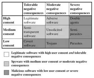 In addition to the direct negative consequences, we also introduce indirect negative consequences. By doing so our classification distinguishes between any negative behaviour a program has been designed to carry out (direct negative consequences) and security threats introduced by just having that software executing on the system (indirect negative consequences). One example of an indirect negative consequence is the exploitation risk of software vulnerabilities in programs that execute on users’ systems without their knowledge.[10]