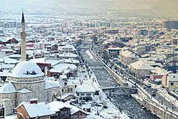 The fast-flowing river water passes under Prizren's many bridges as it travels through the city.[2]