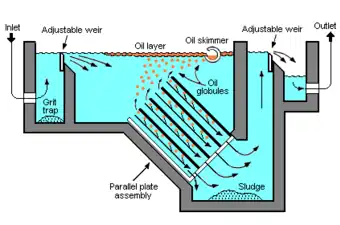 Produced water from the separator(s) and coalescer is routed to a produced water degasser operating at near atmospheric pressure to remove dissolved gas from the water. In the early days of the offshore industry parallel plate separator units were used to clean produced water prior to overboard disposal. Hydrocyclones, which are more compact, were introduced in the 1980s.[1] A hydrocyclone removes entrained oil and solids from produced water which then passes to the degasser and can then either be re-injected into the reservoir or dumped overboard. Induced gas flotation plant is used when the hydrocyclone / degasser plant cannot achieve the oil-in-water specification. For overboard disposal the water should have an oil content of less than about 30 parts per million (ppm) oil-in-water.[11] On North Sea installations the higher operating temperatures allow an oil-in-water concentration of > 20 ppmw to be achieved.[4]