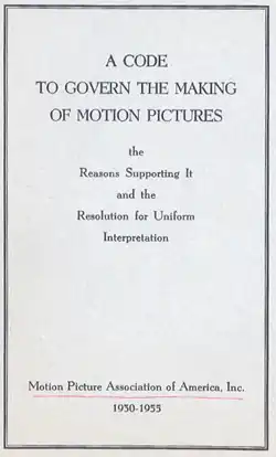 The code was divided into two parts. The first was a set of "general principles" which prohibited a picture from "lowering the moral standards of those who see it", so as not to wrongly influence a specific audience of views including, women, children, lower-class, and those of "susceptible" minds, called for depictions of the "correct standards of life", and lastly forbade a picture to show any sort of ridicule towards a law or "creating sympathy for its violation".[30] The second part was a set of "particular applications", which was an exacting list of items that could not be depicted. Some restrictions, such as the ban on homosexuality or on the use of specific curse words, were never directly mentioned, but were assumed to be understood without clear demarcation. The Code also contained an addendum commonly referred to as the Advertising Code, which regulated advertising copy and imagery.[31]