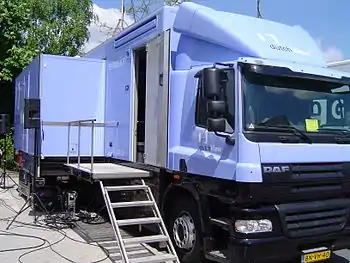 A television production truck or OB van is a small mobile production control room to allow filming of events and video production at locations outside a regular television studio. They are used for remote broadcasts, outside broadcasting (OB), and electronic field production (EFP). Some require a crew of as many as 30 people,[1] with additional trucks for additional equipment as well as a satellite truck, which transmits video back to the studio by sending it up through a communications satellite using a satellite dish, which then transmits it back down to the studio.[2] Alternatively, some production trucks include a satellite transmitter and satellite dish for this purpose in a single truck body to save space, time and cost.
