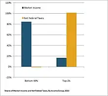 While the CBO report does combine transfers to one's income for purposes of calculating Before-Tax Income, it does not net out Government Transfers from one's tax liability for purposes of calculating rates based on Market Income. While presentation of income strata based on Before-Tax Income may be technically correct, there are certain unintuitive outcomes; based on the Before-Tax Income metric, an individual with severe health issues that subsists purely on Government Transfers may be considered part of the top one percent of income earners if his healthcare costs exceed the minimum threshold. Based on the data provided by the CBO, the resulting Net Tax liability as compared to income is presented in the accompanying charts. As of 2010, the bottom 99% by Market Income taken as a group had a negative Net Federal Tax burden, while the top 1 percent by Market Income paid in the aggregate 101% of Net Federal Taxes.
