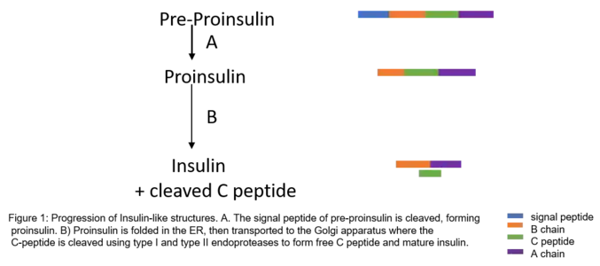 Proinsulin is synthesized on membrane associated ribosomes found on the rough endoplasmic reticulum, where it is folded and its disulfide bonds are oxidized. It is then transported to the Golgi apparatus where it is packaged into secretory vesicles, and where it is processed by a series of proteases to form mature insulin. Mature insulin has 35 fewer amino acids; 4 are removed altogether, and the remaining 31 form the C-peptide. The C-peptide is abstracted from the center of the proinsulin sequence; the two other ends (the B chain and A chain) remain connected by disulfide bonds.