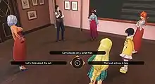 As with previous entries, the gameplay is split between adventure segments where Kamiyama explores Ginza and talks to the characters; and battle segments.[2] A returning gameplay element is the traditional "Live & Interactive Picture System" (LIPS); during conversations, the player is presented with multiple choices to select within a time limit. What response the player selects directly affects Kamiyama's relationship with the protagonists and impacts their later performance in battle segments; Kamiyama's responses also affect supporting non-playable characters (NPCs). The version introduced in this game is "Analog LIPS", in which the player can move the camera around and highlight objects or people to trigger more dialogue.[1][3][4] In one-on-one conversation segments, the player can move the cursor over background elements or the characters to trigger internal monologues and varying responses from the characters.[5] Players may save their game automatically at the start of the adventure and battle parts of each chapter and manually during intermissions and while exploring, which also includes the statuses of the main heroines as well as supporting NPCs.[6]