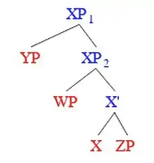 In a local domain there are three main levels. The head (X) of the local domain is at the bottom which projects up to and X bar level and then to the XP level. Each head can select for a complement. The X bar level can select for a specifier and the XP level can select for an adjunct. This makes up the basic structure of a local domain. The components of the tree are organized hierarchically.[4] Along with this, the adjunct (YP), specifier (WP) and complement (ZP) are all optional and only used when required[4]