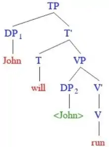 In order to satisfy the EPP we must move the DP John into spec TP, to allow for the TP subject to be filled[6] By moving the DP we are altering the sentence making it John will Run. The EPP will now be satisfied as the DP John is now in the subject position of the TP.[4]