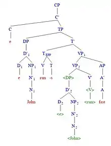 [CP[C'[C e][TP[DP[D'[D e][NP[N'[N John]]]]][T'[T_EPP [V run] [T -s]][VP[VP[<DP>[D'[D <e>][NP[N'[N <John>]]]]][V'[⟨V⟩ ⟨run⟩]]][AP[A'[A fast]]]]]]]]
