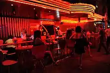 Women ("bargirls"), or men, in the case of gay bars, or transsexual ("kathoeys") are employed by the bars either as dancers (in the case of go-go bars) or simply as hostesses who will encourage customers to buy them drinks. Apart from these sorts of bars, there are a number of other sex trade venues. In most of these establishments the prostitutes are directly employed, but in hotels, some bars and discos freelance prostitutes are allowed to solicit clients.[57][58] Prostitutes will usually receive a commission when a customer buys drinks and sexual services can be arranged to take place on premises or elsewhere (with the latter requiring the customer to pay a "bar fine" to release the prostitute from the bar).[31][59] The relationships established in such contexts superficially mimic the "dating" culture of the west, with a mix of friendship, intimacy, sexual entertainment, and money.[60]