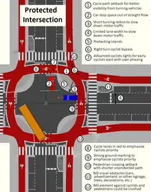 A protected intersection or protected junction, also known as a Dutch-style junction, is a type of at-grade road junction in which cyclists and pedestrians are separated from cars. The primary aim of junction protection is to help pedestrians and cyclists be and feel safer at road junctions.[1]