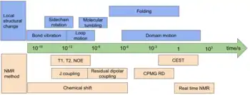 Protein nuclear magnetic resonance (NMR) is able to collect protein structural data by inducing a magnet field through samples of concentrated protein. In NMR, depending on the chemical environment, certain nuclei will absorb specific radio-frequencies.[54][55] Because protein structural changes operate on a time scale from ns to ms, NMR is especially equipped to study intermediate structures in timescales of ps to s.[56] Some of the main techniques for studying proteins structure and non-folding protein structural changes include COSY, TOCSYHSQC, time relaxation (T1 & T2), and NOE.[54] NOE is especially useful because magnetization transfers can be observed between spatially proximal hydrogens are observed.[54] Different NMR experiments have varying degrees of timescale sensitivity that are appropriate for different protein structural changes. NOE can pick up bond vibrations or side chain rotations, however, NOE is too sensitive to pick up protein folding because it occurs at larger timescale.[56]
