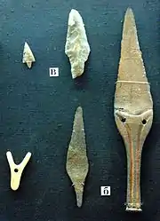Although Proto-Indo-Europeans have been often cast as warlike conquerors, their reconstructed arsenal is not particularly extensive.[102][103] There is no doubt that they possessed archery, as several words with the meaning of "spear" (*gʷéru ; *ḱúh₁los), "pointed stick" (*h₂eiḱsmo) or "throwing spear" (*ǵʰai-só-s) are attested.[104] The term *wēben meant a "cutting weapon", probably a knife, and *h₂/₃n̩sis a "large offensive knife", likely similar to bronze daggers found across Eurasia around 3300–3000 BCE. Proto-Indo-Europeans certainly did not know swords, which appeared later around 2000–1500.[105][102][106] The axe was known as *h₄edʰés, while the word *spelo/eh₂ designated a wooden or leather shield.[102] The term *leh₂wós meant "military unit" or "military action",[107][108] while *teutéh₂- might have referred to the "adult male with possession" who would mobilize during warfare, perhaps originally a Proto-Indo-European term meaning "the people under arms".[52][108]