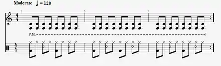 The rhythm in metal songs is emphatic, with deliberate stresses. Weinstein observes that the wide array of sonic effects available to metal drummers enables the "rhythmic pattern to take on a complexity within its elemental drive and insistency".[22] In many heavy metal songs, the main groove is characterized by short, two- or three-note rhythmic figures – generally made up of eighth or 16th notes. These rhythmic figures are usually performed with a staccato attack created by using a palm-muted technique on the rhythm guitar.[37]