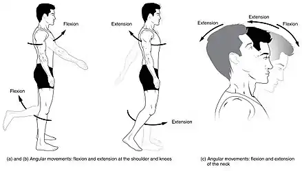 Extension is the opposite of flexion, a straightening movement that increases the angle between body parts.[12] For example, when standing up, the knees are extended. When a joint can move forward and backward, such as the neck and trunk, extension is movement in the posterior direction.[10] Extension of the hip or shoulder moves the arm or leg backward.[11] Even for other upper extremity joints - elbow and wrist, backward movement results in extension. The knee, ankle, and wrist are exceptions, where the distal end has to move in the anterior direction for it to be called extension.[13]