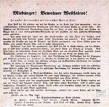 In Westphalia, there were very diverse reactions to the outbreak of revolution in 1848.[8] The democratic left of the "Rhede Circle" celebrated the coming of a new era in the Westphälisches Dampfboot, "The people of Europe, freed from the oppressive nightmare, have almost caught their breath." The journal Hermann, published in Hamm supported the introduction of a new calendar era, on the model of the French revolutionary calendar. The left also looked to France for their political programme and called for "Wealth, Education, and Freedom for all." There were also countervailing opinions, like that of Bielfeld superintendent and later member of the Prussian National Assembly, Clamor Huchzermeyer, who spoke of a "disgraceful event", in which the "simple Philistine" expected "that a constitution would sweep all misery and inequality from the world." He feared instead the "collapse of all order" and general "disorder."[9]