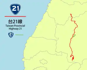 Taiwan Provincial Highway No. 21 is a Provincial Highway in Taiwan that begins at Tianleng (天冷), Dongshi District, Taichung City, at the intersection with Provincial Highway No. 8 (Central Cross-Island Highway), and ends at Tataka(塔塔加), where it is connected with Provincial Highway No. 18 (New Central Cross-Island Highway) in Yushan National Park. It is the primary highway to Sun Moon Lake, a popular tourist destination. The total length is 145 km.[1]