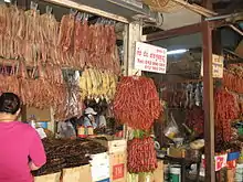 The market is popular with tourists in the city and sells souvenirs, including T-shirts, silverware, silk, wood and stone carvings, Buddhas, and other items.[3] It is also known for its variety of Cambodian cuisine, and has a number of food stalls which sell a variety of rices, dried fish and pork sausages, vegetables and fruits, and a fermented fish paste prahok, a type of. Some stalls sell baguettes and stuffed grilled frogs,[4] while others offer various Khmer soups.