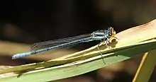A medium-sized damselfly (length 31–3 mm; wingspan 39–47 mm).[3] The face is black and yellow and it lacks post-ocular spots. The eyes are black above and yellow below. The synthorax is dark blue above and the sides are pale, pruinescent blue. The abdomen is dark blue above and yellow green below, ageing to pruinescent grey.[2]
