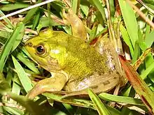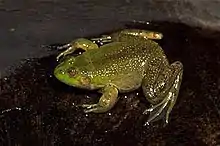 Males measure 22–46 mm (0.9–1.8 in) and females 30–57 mm (1.2–2.2 in) in snout–vent length.[2][5] The body is robust. The head is broad and the snout is rounded. The tympanum is distinct. The forearms are robust with robust fingers; no webbing is present. The hind limbs are short and robust with extensively webbed toes. The body and the limbs are dorsally light to dark green, olive, or brownish. There are usually some darker spots or blotches of irregular form. A black or dark green stripe runs along the canthus rostralis; it can be narrow or broad and blot-like. The tympanum is olive, tan or light brown. The lateral surfaces of head, body, and thigh are light yellow. Ventral surfaces are white. Males have paired vocal sac.[2]