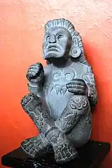 The statue of the Aztec "god of flowers", Xochipilli, a 16th-century stone effigy unearthed on the side of the volcano Popocatépetl, depicts a single figure seated cross-legged upon a temple-like base; his body is covered in carvings of sacred and psychoactive organisms. Circular patterns on his kneecaps, right forearm, and headdress have been interpreted by R. Gordon Wasson as stylized fruit bodies of Psilocybe aztecorum. Wasson says that the convex shape and incurved margins depicted in these images show the mushroom caps just before maturity.[22][23] P. aztecorum is, in addition to P. caerulescens, one of two mushrooms thought to be the species described by 16th-century Spanish chronicler Bernardino de Sahagún as the teonanácatl. The word teonanácatl (Nahuatl pronunciation: [teoːnaˈnakat͡ɬ]) has been variously translated as "sacred or divine mushroom" or as "flesh of the gods".[13][24][25] These mushrooms, considered holy sacraments by the Aztecs, were consumed during spiritual and divinatory rituals to induce hallucinatory visions.[1][11][26]