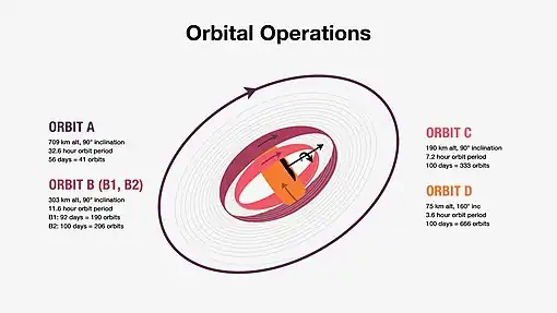 Its first regime, Orbit A, will see the spacecraft enter a 700 km (430 mi) orbit for magnetic field characterization and preliminary mapping for a duration of 56 days. It will then descend to Orbit B, set at 303 km (188 mi) altitude for 92 days, for topography and magnetic field characterization. It will then descend to Orbit D, which is the lowest orbit at 75 km (47 mi) and is also uniquely inclined to allow direct view of the asteroid's equator (compared to the other orbits that go around its poles), for 100 days to determine the chemical composition of the surface using its gamma-ray and neutron spectrometers. After that it will ascend to Orbit C at 190 km (120 mi) altitude for 100 days to perform gravity investigations and continue magnetic field observations. Finally, the orbiter will return to Orbit B for 100 days, to finish mapping the portion of the asteroid's surface that was under darkness during the first portion of Orbit B. It will also acquire continued imaging, gravity, and magnetic field mapping. In total, the prime mission is expected to last 26 months, ending in November 2031. At the end of the mission, the spacecraft will be left in orbit around the asteroid.[60][51][39][61]