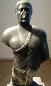 In Ptolemaic art, the idealism seen in the art of previous dynasties continues, with some alterations. Women are portrayed as more youthful, and men begin to be portrayed in a range from idealistic to realistic.[52][53] An example of realistic portrayal is the Berlin Green Head, which shows the non-idealistic facial features with vertical lines above the bridge of the nose, lines at the corners of the eyes and between the nose and the mouth.[54] The influence of Greek art was shown in an emphasis on the face that was not previously present in Egyptian art and incorporation of Greek elements into an Egyptian setting: individualistic hairstyles, the oval face, "round [and] deeply set" eyes, and the small, tucked mouth closer to the nose.[55] Early portraits of the Ptolemies featured large and radiant eyes in association to the rulers' divinity as well as general notions of abundance.[56]