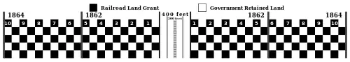Ten square miles of land on each side of the proposed rail track were granted for every one mile of completed railway. The PLSS was utilized for measurement. Every one-mile length of railway completed was akin to a section. If the railway ran predominantly east and west, a 10-mile (16 km) range of one square mile sections was allotted on each side of the 400-foot (120 m) right-of-way. If the railway ran predominantly north and south, a 10-mile (16 km) township of one square mile sections was allotted on each side of the 400-foot (120 m) right-of-way. The land was granted in alternating sections (one square mile), with each odd numbered section going to the railroad company and each even numbered section kept by the government. This created a checkerboard pattern along proposed railways. This was supposed to guarantee that railroad access would increase the value of both the railroad-granted sections and the government-owned sections in the checkerboard. The system was devised by Senator Stephen A. Douglas, with political support from Senator Jefferson Davis.[8]