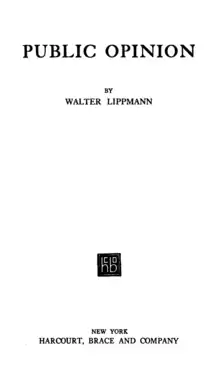 Public Opinion is a book by Walter Lippmann published in 1922. It is a critical assessment of functional democratic government, especially of the irrational and often self-serving social perceptions that influence individual behavior and prevent optimal societal cohesion.[1] The detailed descriptions of the cognitive limitations people face in comprehending their sociopolitical and cultural environments, leading them to apply an evolving catalogue of general stereotypes to a complex reality, rendered Public Opinion a seminal text in the fields of media studies, political science, and social psychology.