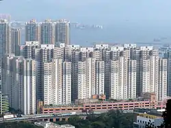 Yau Oi Estate (Chinese: 友愛邨) is the third public housing estate in Tuen Mun. It was built between 1979 and 1982[5] on reclaimed land of Castle Peak Bay.[44] Consisting of 11 residential blocks, it was the largest single subsidized housing development in Hong Kong, with 9,153 units and a population of more than 35,000.[84]