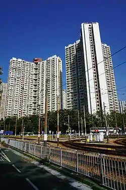 Yuet Wu Villa (Chinese: 悅湖山莊) is a Home Ownership Scheme and Private Sector Participation Scheme court in Tuen Mun, located at the reclaimed land of Castle Peak Bay. It comprises 15 high-rise tower blocks consisting of 3,890 residential units, which were built in 1994.[86][87]