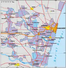 The Puducherry district, also known by its former name Pondicherry district, is one of the four districts of the union territory of Puducherry in South India. The district occupies an area of 290 square kilometres (110 sq mi),[2] spread over 12 non-contiguous enclaves lying on or near the Bay of Bengal within a compact area in the state of Tamil Nadu. According to the 2011 census, the district has a population of 950,289.[3]