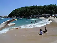 West from Playa Marinero is Playa Principal, or main beach, fronting the town proper. This beach has boats and water taxis are anchored close to shore. Here, fishermen arrive at dawn to sell their catch to local restaurants and families.[5] It is 500 metres long with fine, gray sand and low to moderate surf. This is the primary place to hire boats which take tourists to otherwise inaccessible beaches, to see porpoises and marine turtles or for deep-sea fishing.[8] This beach is also popular with Mexican families to picnic on and play soccer.[14]