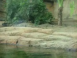 The outdoor enclosure is about 8 by 9 metres (26 by 30 ft), of which 70% is pool area. With a maximum depth of one metre, the pool is landscaped with plants to provide sheltered areas, hiding places and basking areas for the reptile. Outdoor facilities include infra-red heaters, a heat pad and a weighing scale. Water in the pool is continuously circulated through a filtration system.