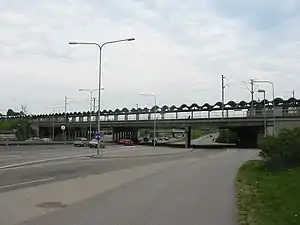 The station viewed from a nearby bridge. There are bus stops on either side of Kehä I under the station