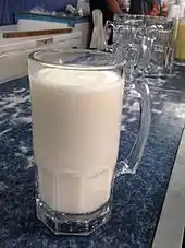 Pulque is a milky, foamy, alcoholic beverage native to central Mexico and made from fermented maguey sap,[1] similar to tequila and mescal but with a much lower alcohol content, between 3 and 4%.[2] The maguey plant flourishes in hot climates with little to no water, as the plant stores water very well, much like a cactus.[3] The maguey grows slowly and the sap must be removed shortly before the plant flowers.[4] Once the tapping begins, the plant produces "about a half gallon [of sap] a day for three months."[4] With a tool that looks like a spoon and is called a tlaquiche, a worker known as a tlachiquero "scrapes off the center of the plant to extract the liquid previously mentioned. He then collects it in a hollow bowl called an acocote, to then be placed in a container called an odre."[5] The containers used for the fermentation process are usually made from animal skins, often cow leather. Leather is popular because of its ability to thermoregulate; leather also provides the sap with necessary beneficial bacteria cultures that improve taste and consistency.[4] Pulque naturally ferments in less than twenty-four hours.[4] Because it will spoil quickly after this period, every step in the process must be taken in close sequence and physical proximity.[4] The maguey plants, the production and distribution facilities, and the places to which the pulque is distributed must all be relatively close together geographically. The taste has been described as slightly sour.[1] Pure pulque is often mixed with fruit juices and other foods to create different flavors.[4]