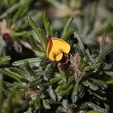 Pultenaea canaliculata, commonly known as coast bush-pea,[2] is a species of flowering plant in the family Fabaceae and is endemic to coastal areas of southern continental Australia. It is an rigid, spreading shrub with hairy, cylindrical leaves, and yellow and crimson flowers.