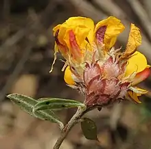 Pultenaea capitellata, commonly known as hard-head bush-pea,[2] is a species of flowering plant in the family Fabaceae and is endemic to south-eastern continental Australia. It is a sprawling to prostrate shrub with elliptic to broadly egg-shaped leaves, and yellow to orange flowers with a red to purple keel.