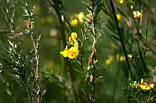 Pultenaea divaricata is a species of flowering plant in the family Fabaceae and is endemic to a small area of New South Wales. It is an erect shrub with linear, needle-shaped, grooved leaves, and dense clusters of yellow to orange flowers with red markings.