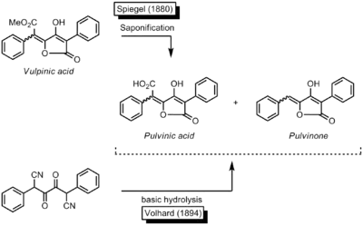 Fungi (such as boleti), moulds and lichens produce a wide range of pigments made up of one (monomer) or several (oligomers) units of pulvinic acid. In 1831, in the course of a study of the constituents of lichens (Cetraria Vulpina), the French chemist and pharmacist Antoine Bebert discovered a compound named vulpinic acid, the first known naturally occurring methyl ester of pulvinic acid. More details about the structure of this pigment were disclosed in 1860 by the German chemists Franz Möller and Adolph Strecker.[2] While trying to elucidate the structure of vulpinic acid, the German chemist Adolf Spiegel[3][4][5][6] found in 1880 that the vulpinic acid could be saponified to a diacid. He named the resulting diacid pulvinic acid. The German chemist Jacob Volhard[7] elucidated the constitution of pulvinic acid by synthesizing it through the basic hydrolysis of a corresponding dicyanocompound. In the process, he also obtained small amounts of a side-product. One year later Ludwig Claisen and Thomas Ewan[8] achieved the synthesis of this side-product and characterized it as the 5-benzylidene-4-hydroxy-3-phenylfuran-2(5H)-one.
