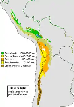 This ecoregion is a high elevation, wet, montane grassland in the southern high Andes, occurring from northern Peru to northern Bolivia. The wet puna shares its border on the west with the Sechura desert and the east with the wet Peruvian Yungas. The characteristically mountainous landscape contains high lakes, mountain valleys, snow-covered mountains, and plateaux.[2] The high elevation of the wet puna (4200 to 5000 m) causes the area to have large temperature differences between night and day. The average annual temperature is low, ranging from 5 to 7 °C; with night frost periods from March to October. Temperatures shift from characteristic summer highs in the day and drop to winter lows at night. This extreme temperature shift has caused selective adaptation to occur and many endemic plants such as the Culcitium, Perezia, and Polylepis center their diversity in the wet puna.[3] The ecoregion contains snow-capped peaks, glacial lakes, and several rivers that originate in the Cordilleras. The biggest lake in the ecoregion is Lake Titicaca, which is the highest navigable lake in the world, at an elevation of 3800 m (above sea level). The Suches and Tiwanacu rivers in Bolivia are the lakes tributaries. The areas in the north surrounding Lake Titicaca have eight wet months, and the areas in the south have one to two wet months.[2] The average precipitation in this region ranges from 400 to 2000 mm.