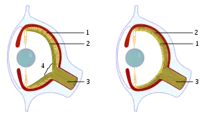 In vertebrate eyes, the nerve fibers route before the retina, blocking some light and creating a blind spot where the fibers pass through the retina and out of the eye. In octopus eyes, the nerve fibers route behind the retina, and do not block light or disrupt the retina. In the example, 4 denotes the vertebrate blind spot, which is notably absent in the octopus eye. In both images, 1 denotes the retina and 2 the nerve fibers, including the optic nerve (3).