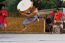 The Pung cholom (Meitei: ꯄꯨꯡ ꯆꯣꯂꯣꯝ, lit. 'roar of the drum') is a traditional Meitei dance form originated from Manipur, which is the soul of the Manipuri Sankirtana music and the Manipuri classical dance.[1][2][3] The Pung cholom is a unique classical dance of Manipur. This dance may be performed by men or women and is usually a prelude to the Ras Lila.[1][2][3] In this style, the dancers play the pung (a form of hand beaten drum) while they dance at the same time. Dancers need to be graceful and acrobatic at the same time. They use these acrobatic effects without breaking the rhythm or flow of music.[1][2][3] The dance is marked by a gentle rhythm, which gradually builds up to a thunderous climax. Pung cholom borrows elements from the Manipuri martial arts, Thang Ta and Sarit Sarak and also from the traditional Maibi Jagoi.[1][2][3]