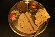 Dairy products are a staple in Punjabi cuisine.[18] Both cow milk and water buffalo milk are popular. Milk is used for drinking, to add to tea or coffee, to make homemade dahi (yogurt), for butter and making traditional Punjabi cottage cheese called paneer.[19] Traditionally, yogurt is made every day using previous day's yogurt as the starting bacterial culture to ferment the milk. Curd is used as dressing for many raita dishes, to prepare Kadhi, to prepare cultured buttermilk (Chaas), and as a side dish in a meal.[20] Buttermilk is used in making various kinds of Lassi.[21][22][23] It may also be used in curry preparations.[24] Milk is also the prerequisite ingredient for butter and Ghee (clarified butter).